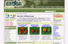| Titel : Exoga ExoGa (Exotischer Garten) ist ein Pflanzen- und Samenversender von exotischen Pflanzen, Saatgut, techn. Zubehör, exot. Dekorationszubehör, usw.. Hier können Sie saisonal von ca. April bis ca. November Pflanzen und Früchte bestellen und Samen bzw. Saatgut das ganze Jahr hindurch. Speziell auf unsere beheizbaren Zimmer Gewächshäuser möchten wir Sie hier hinweisen - damit haben schon etliche Kunden mehr und höhere Keimerfolge erzielt.